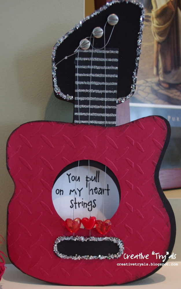 This card is one of my original designs. I had the idea in my mind for a long time but I couldn't figure out the guitar style for a while. The inside sentiment says "You pull on my hearts strings and play a lovely tune." It is made from a full 8 1/2 x 11 sheet, folded in half. I cut the guitar design out, and another base guitar shape. I added strings with heart beads and glued on the a guitar tab to cover the strings to the base. I glued the base onto the full guitar that had brads attached, and the guitar neck already decorated. I wrapped the strings around the brads and added sparkles around the areas I felt needed some bling to them.